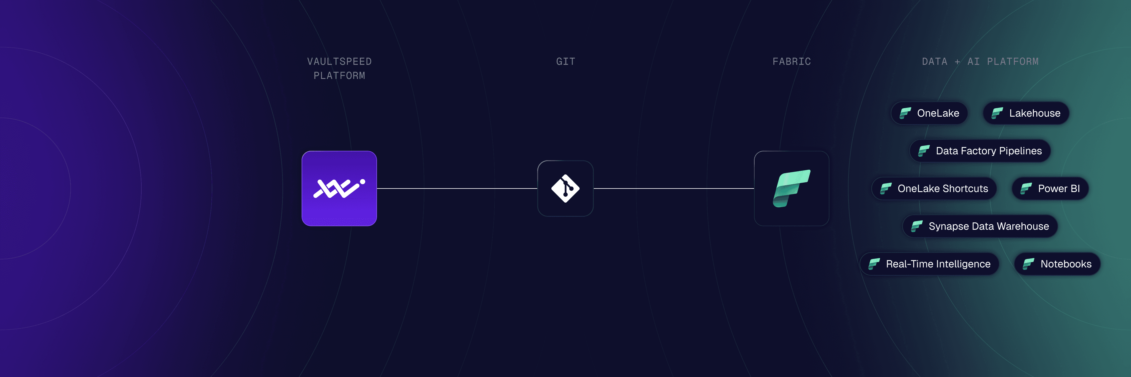 VaultSpeed generates and manages Fabric-native transformation artifacts end-to-end, combining unified analytics execution with centralized metadata control.