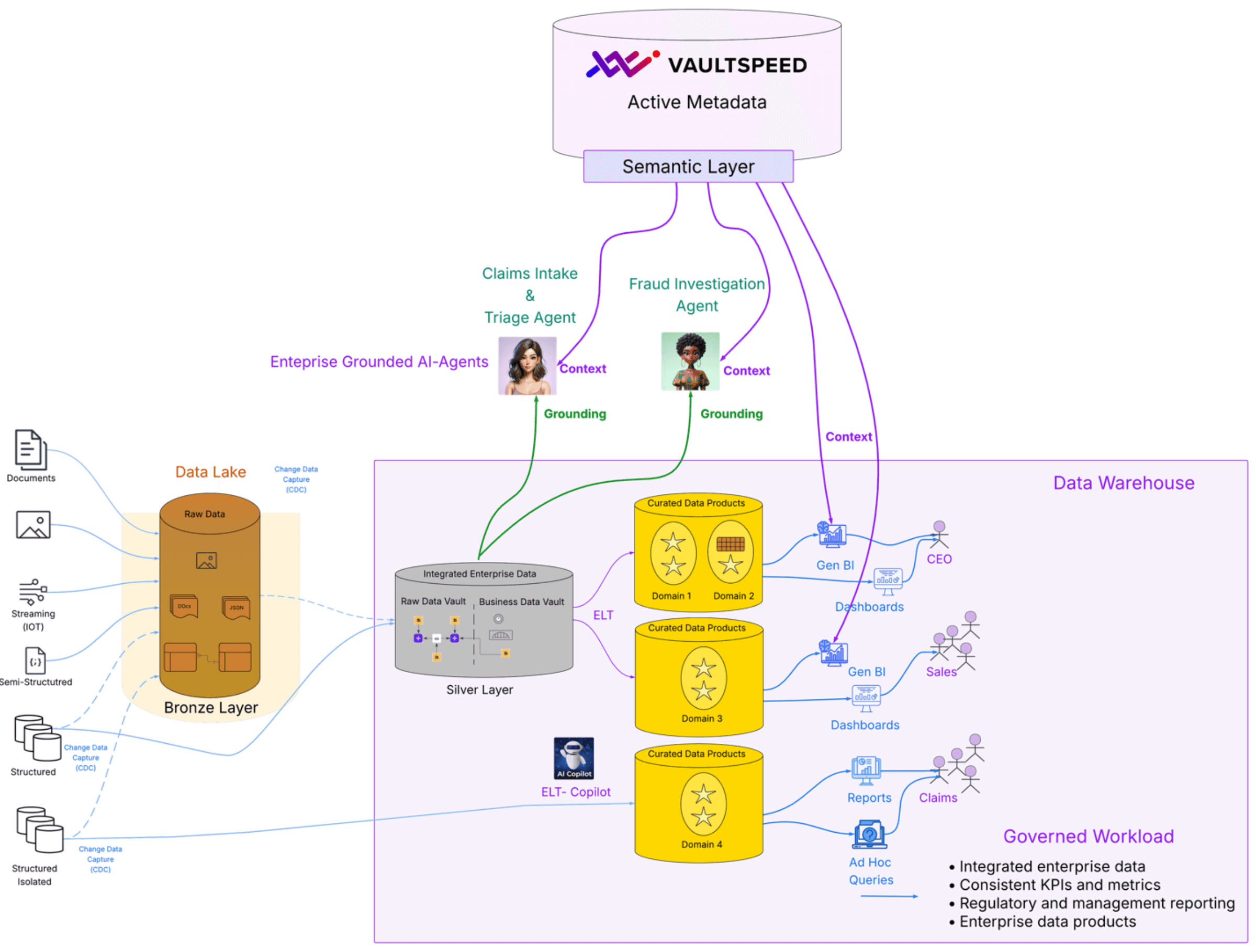 When the governed workload is automated from a formal model, metadata becomes more than documentation. It becomes active context: semantic definitions, relationships, transformation intent, historization logic, and lineage — all kept in sync with the data itself.
