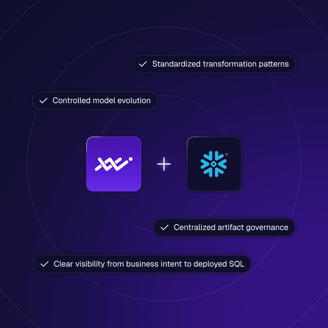 VaultSpeed generates and manages Snowflake-native transformation artifacts end-to-end — combining execution support with centralized metadata control.