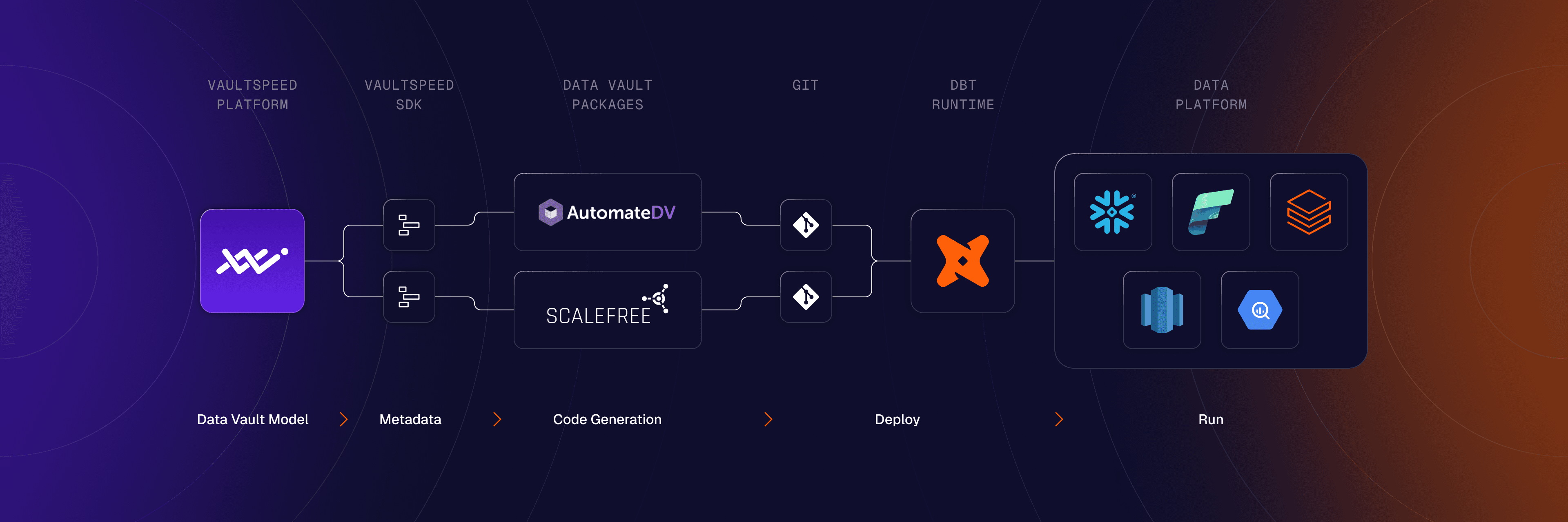 VaultSpeed automates the full Data Vault journey, from design and metadata to code generation, deployment, and execution on modern data platforms.